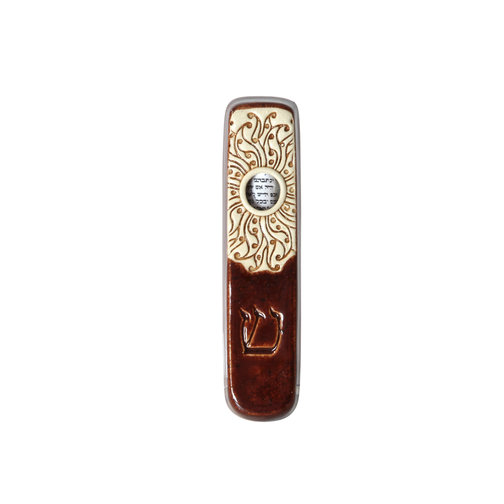 Ručně vyrobená keramická mezuza s motivem Slunce a svatého písmene Šin. Jedinečný ručně vyrobený kus pro milovníky židovské tradice a kultury. Mezuza obsahuje kopii svitku. Košer svitek si můžete zakoupit samostatně na našich webových stránkách.