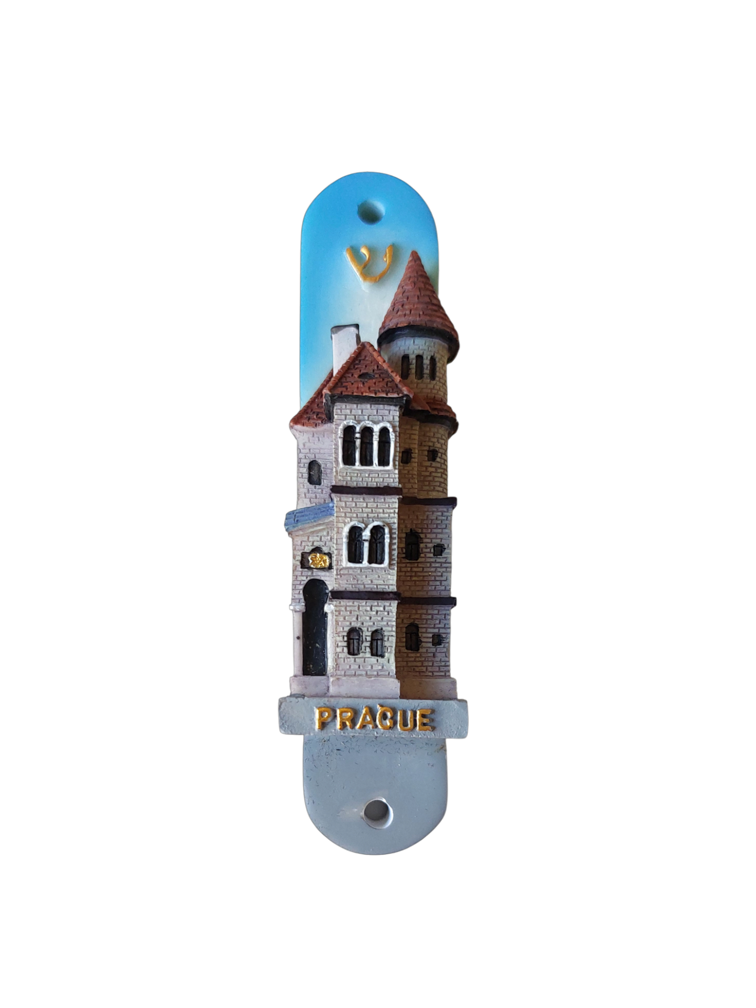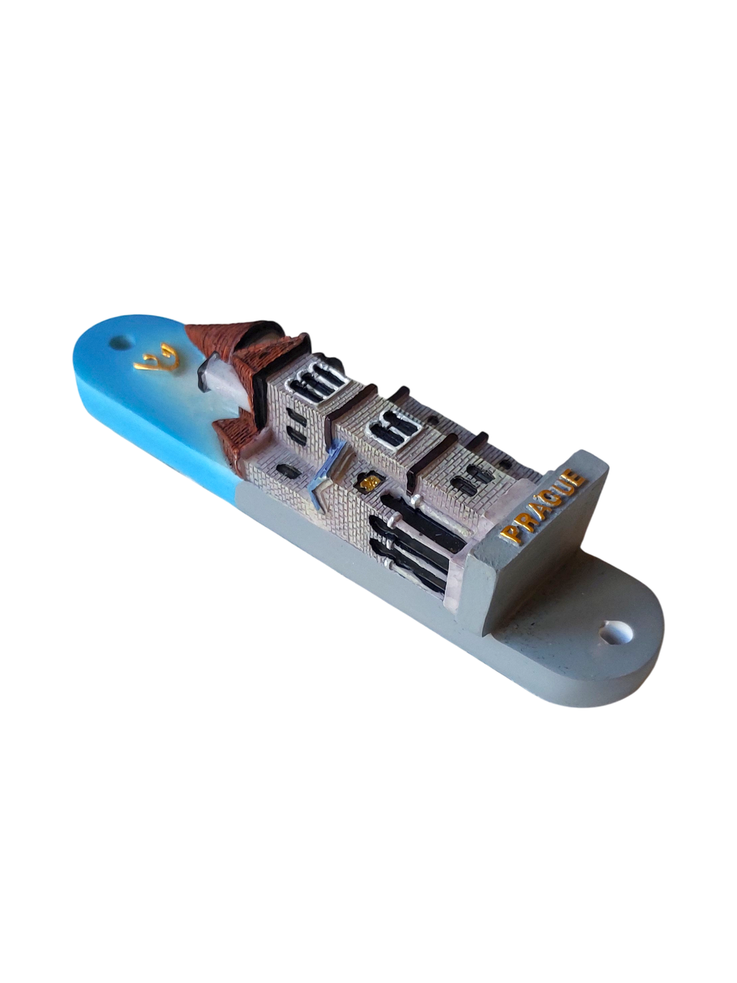 Tato kvalitní keramická mezuza, vyrobená v Praze, připomíná Obřadní síň na pražském Židovském Městě. Pražské Pohřební bratrstvo využívalo obřadní síň (beit tahara) vedle Starého židovského hřbitova. Současná novorománská budova byla postavena v letech 1906–1908 na místě starší stavby. Tato budova sloužila svému původnímu účelu až do konce první světové války. Od roku 1926 je budova součástí Židovského muzea v Praze.