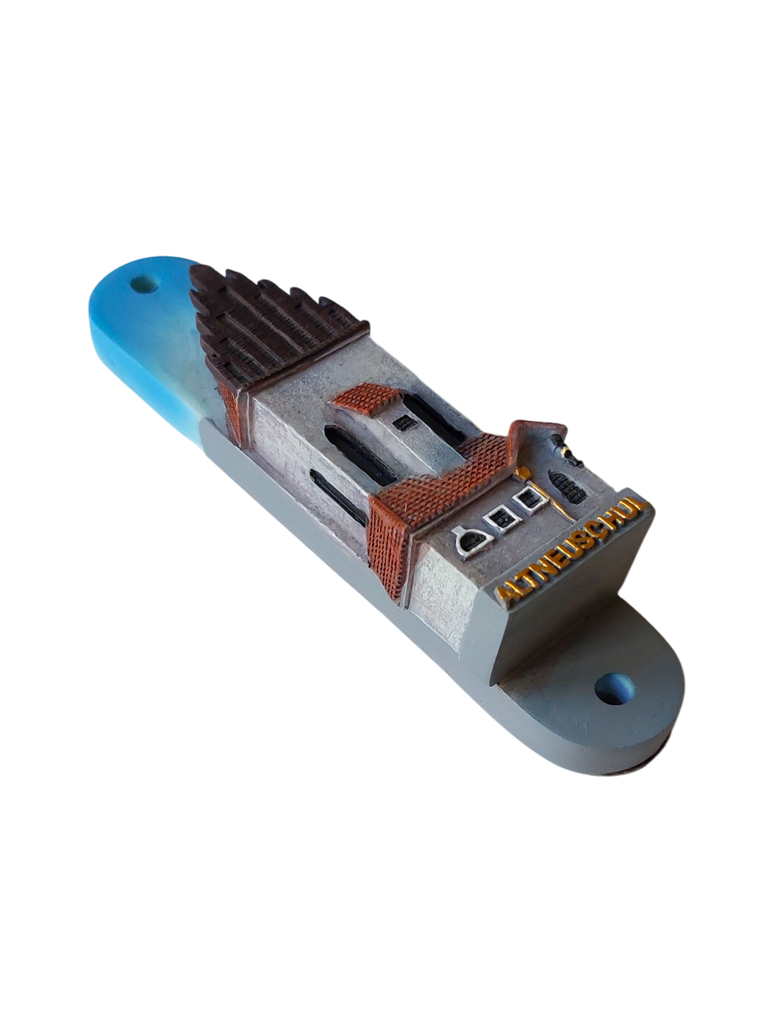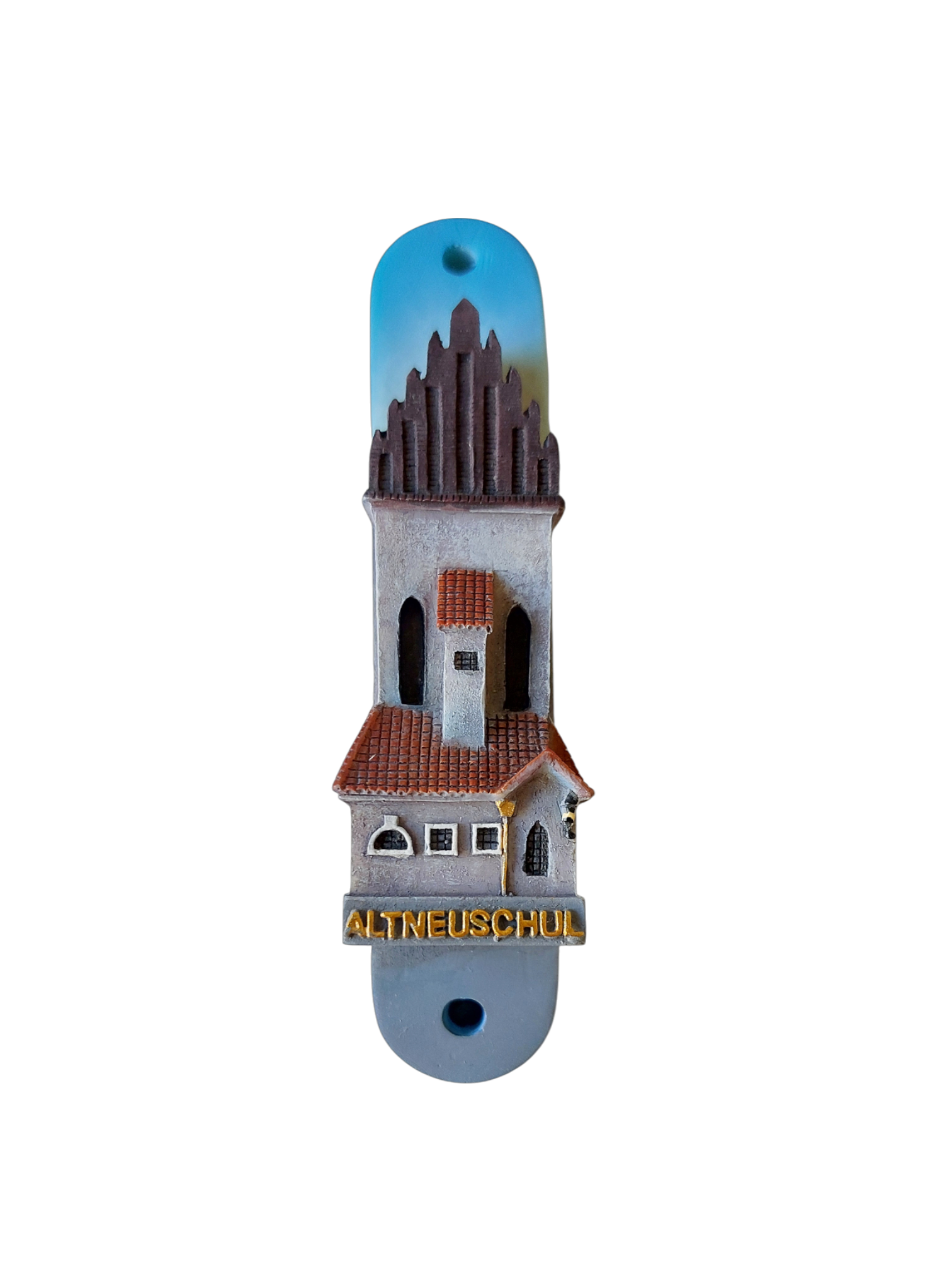 Tato kvalitní keramická mezuza, vyrobená v Praze, připomíná Staronovou synagogu na pražském Židovském Městě, nejstarší dochovanou synagogu v Evropě. Byla postavena na konci 13. století. Podle legendy však její základní kameny přinesli andělé ze zničeného jeruzalémského Chrámu „pod podmínkou“ (hebr. Al-tenai), že se po obnovení Chrámu vrátí. Staronová synagoga se těšila obrovské úctě v pražském Židovském Městě i v židovských obcích v zahraničí. Byla také opředena četnými legendami a pověstmi. Podle jedné z nich chránila synagogu před požárem v ghettu křídla andělů proměněných v holubice, a proto zůstala jako zázrakem neporušená dodnes. Podle jiné legendy se na půdě synagogy nacházejí pozůstatky Golema, umělého tvora z hlíny, kterého oživil rabín Loew, aby chránil pražskou komunitu.