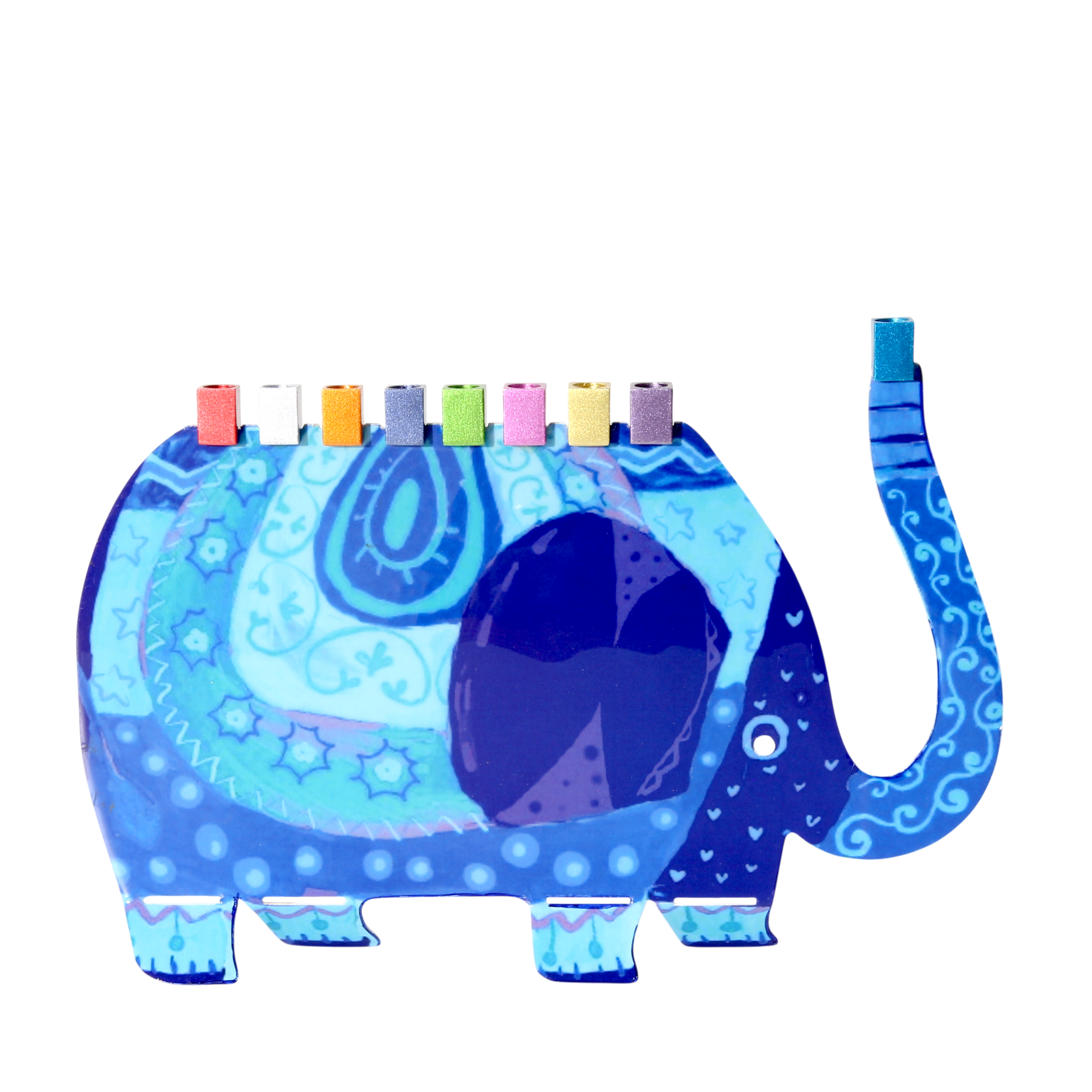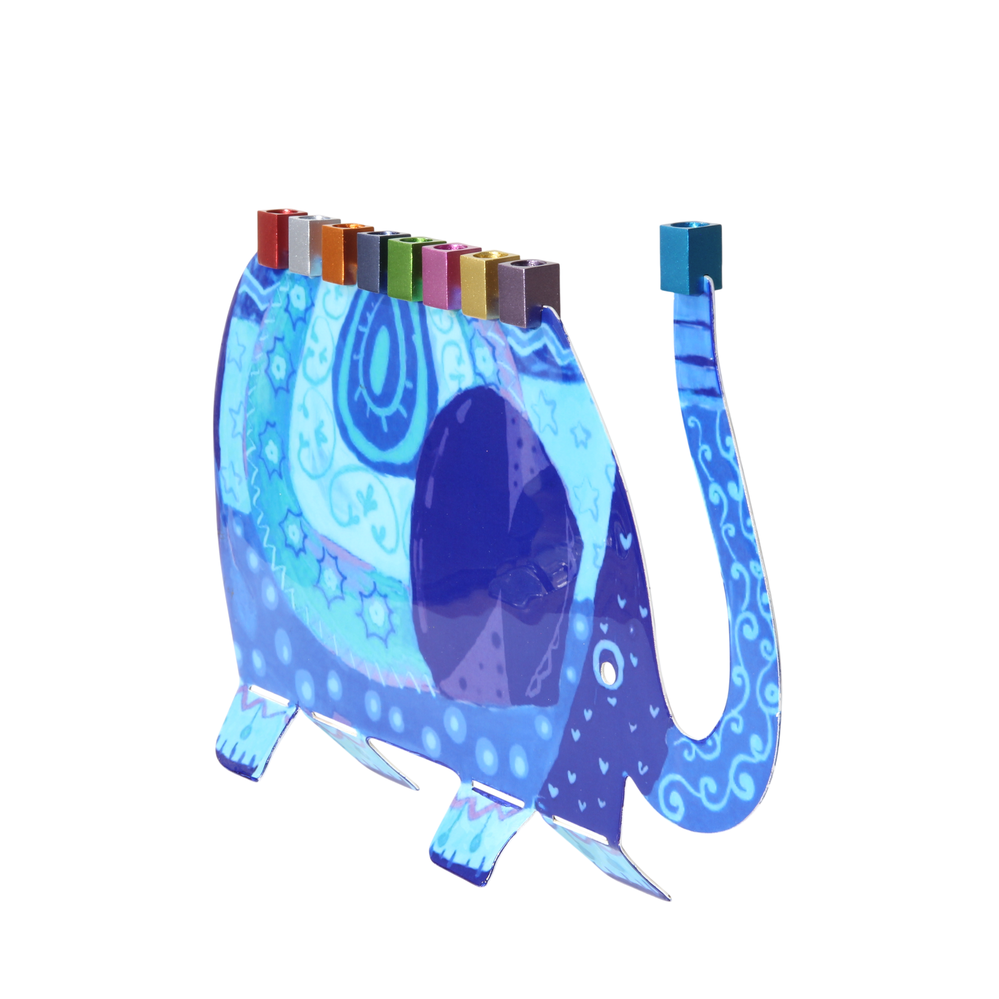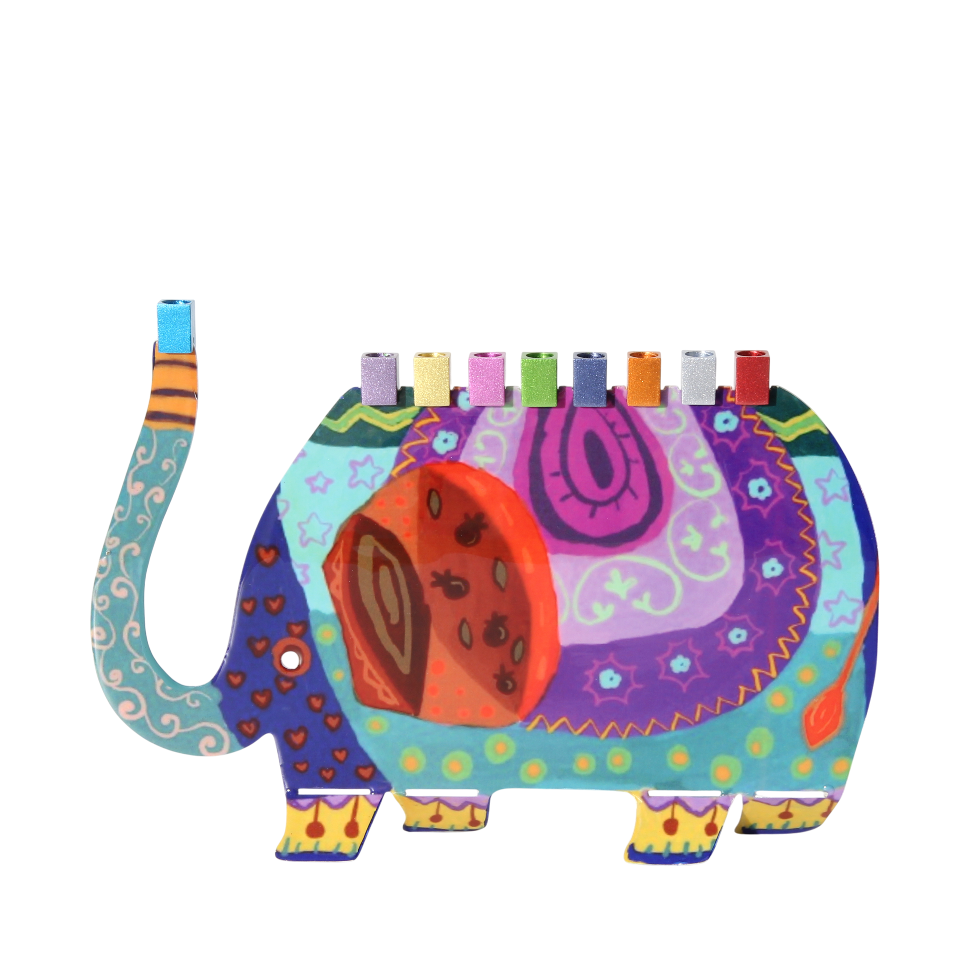 Tento chanukový svícen s motivem slona je ideálním dárkem pro děti. Vyřezaný laserem a ručně malovaný originální technikou jeruzalémského umělce Yaira Emanuela. Svícen lze zapálit jak svíčkami, tak olejem. Svícen můžete čistit poléváním vařící vodou, která vosk očistí.