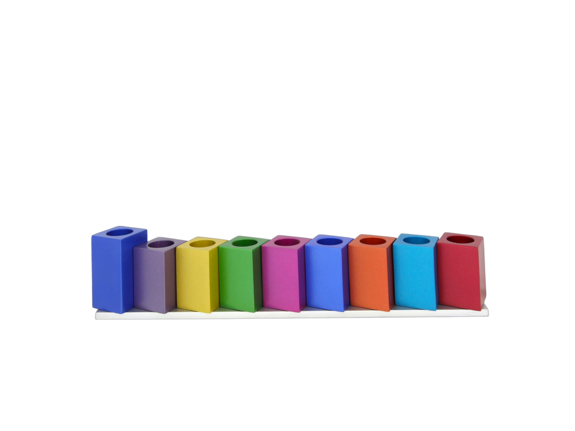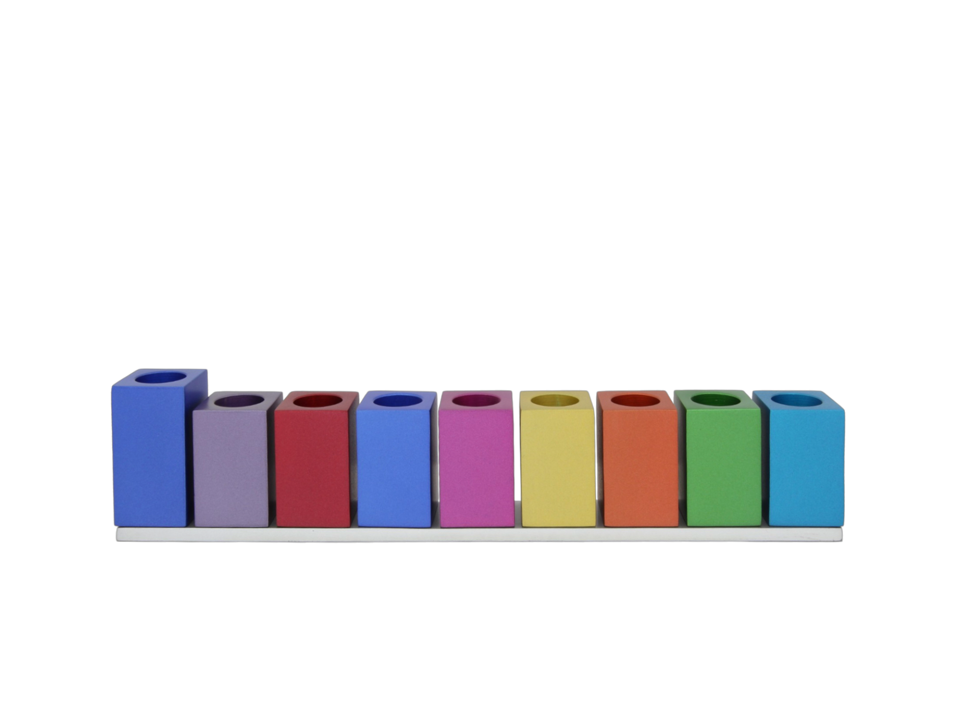 Základna tohoto moderního chanukového svícnu je vyrobena z kovaného poniklovaného hliníku a devět ramen chanukije tvoří krychle natřené různými eloxovanými barvami. Polohu všech krychlí můžete měnit a vytvořit si osobní kombinaci pořadí. Chanukiji lze zapalovat jak svíčkami, tak olejem. Čistit ji můžete poléváním vařící vodou, aby se vosk odstranil.