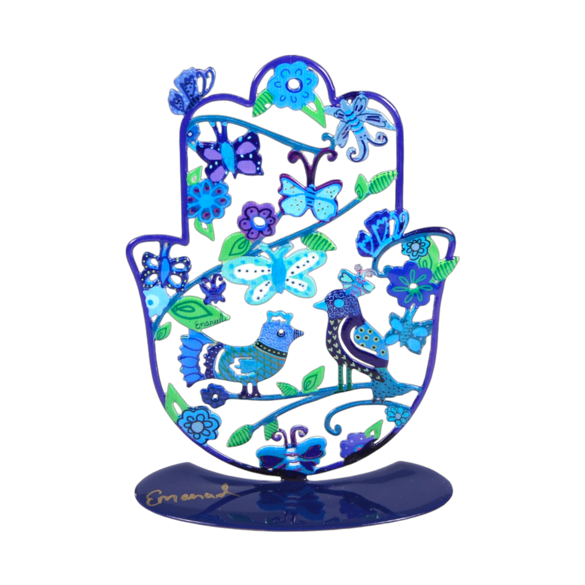 Tato stojící hamsa s různými motivy je vyrobena originální technikou umělce Yair Emanuela z Jeruzaléma. Stojánek je řezaný laserem a ručně malovaný.