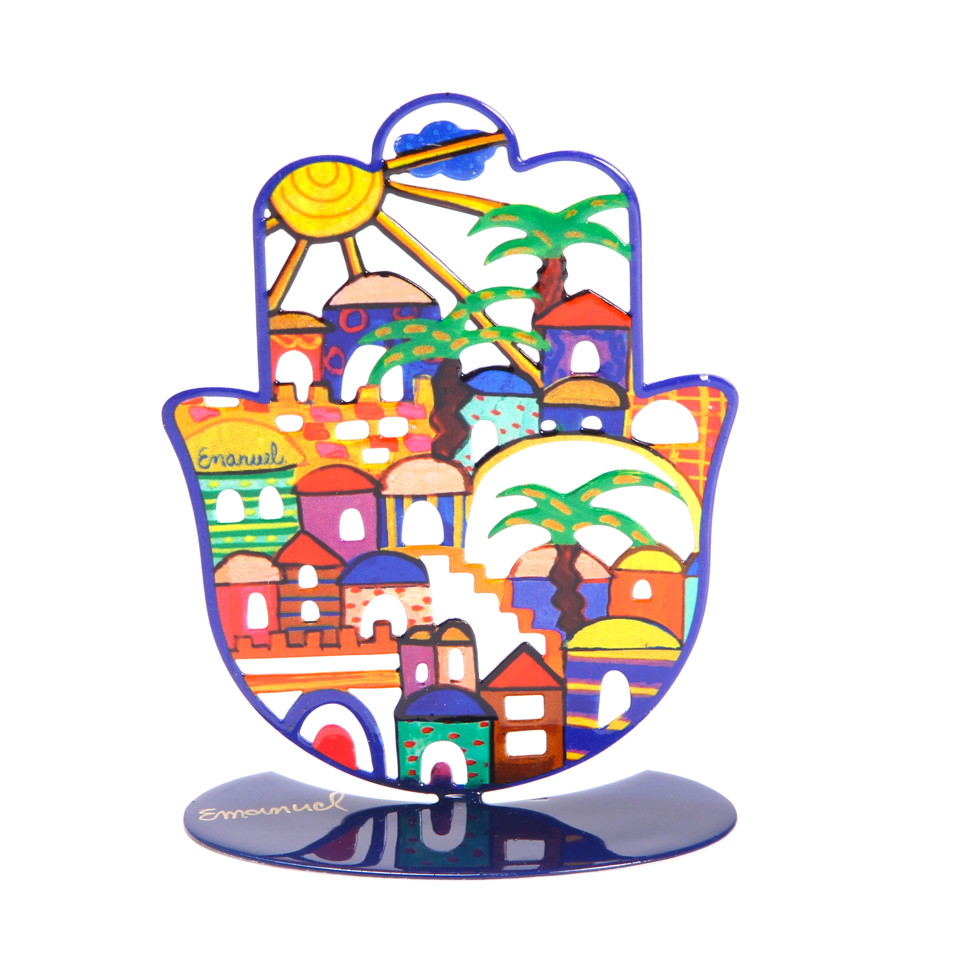 Tato stojící hamsa s různými motivy je vyrobena originální technikou umělce Yair Emanuela z Jeruzaléma. Stojánek je řezaný laserem a ručně malovaný.