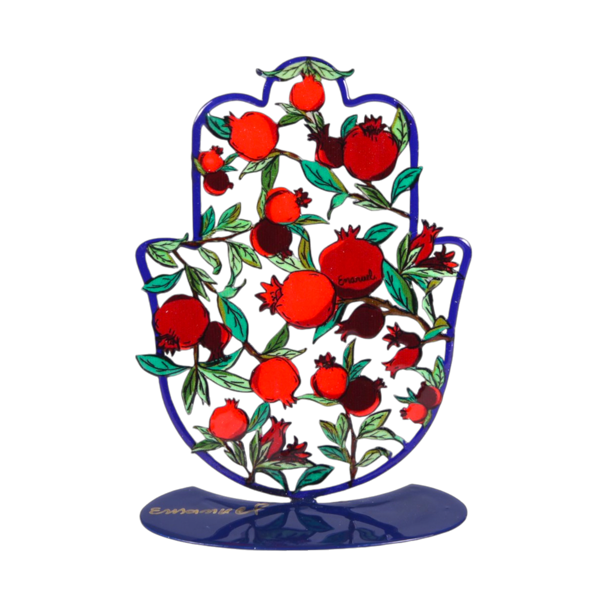 Tato stojící hamsa s různými motivy je vyrobena originální technikou umělce Yair Emanuela z Jeruzaléma. Stojánek je řezaný laserem a ručně malovaný.