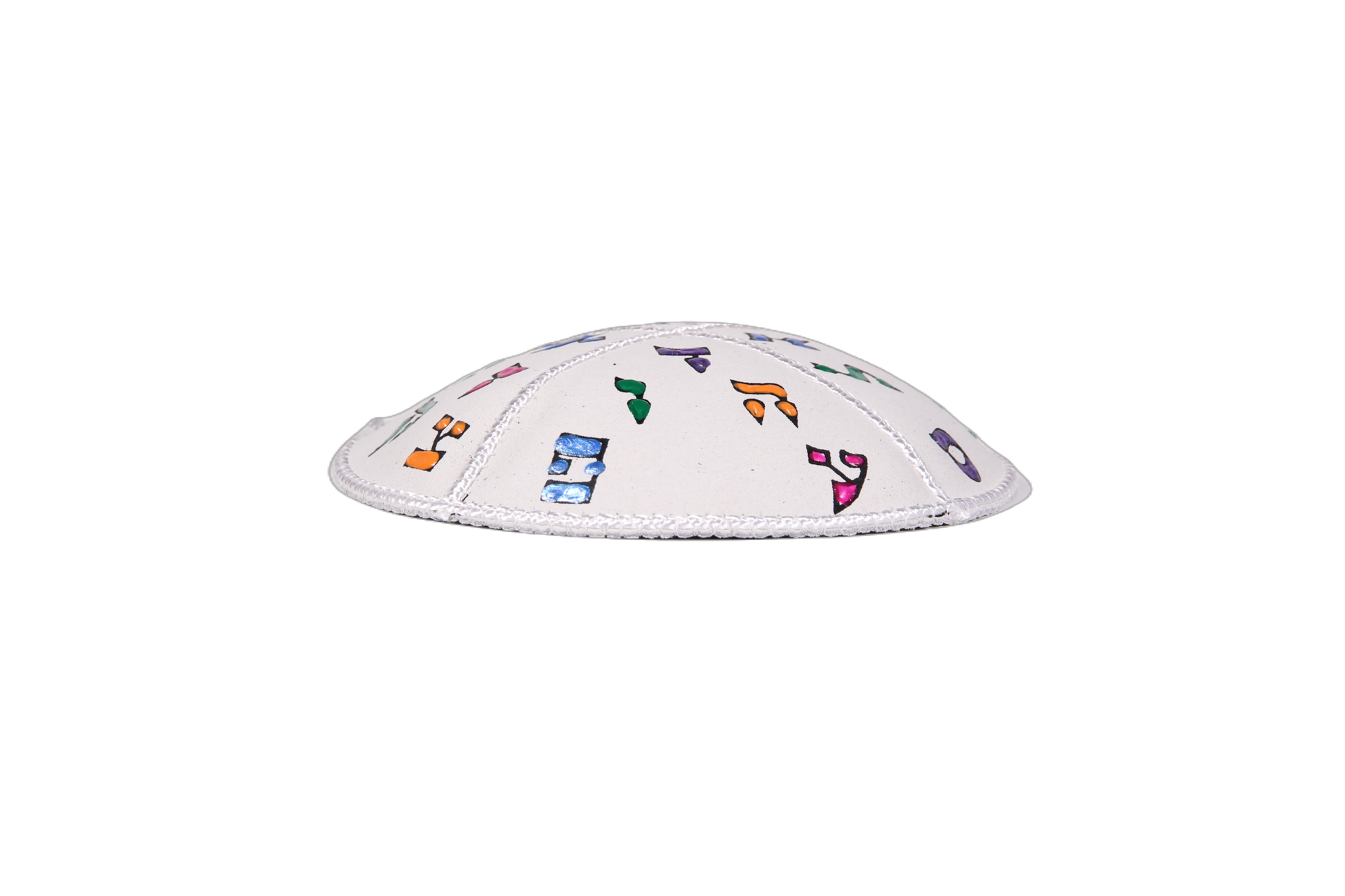 Dětská kožená Kipa s abecedou - bílá se světlými písmeny