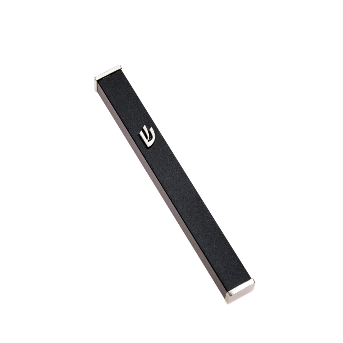 Černá hliníková mezuza s niklovým písmenem Shin. Prodává se bez svitku. Košer svitek lze zakoupit samostatně.