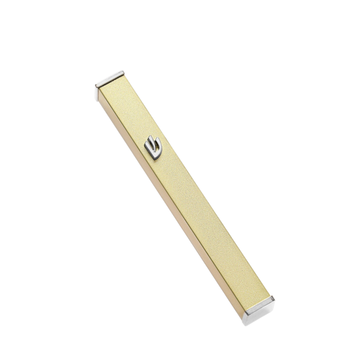 Zlatá hliníková mezuza s niklovým písmenem Shin. Prodává se bez svitku. Košer svitek lze zakoupit samostatně.
