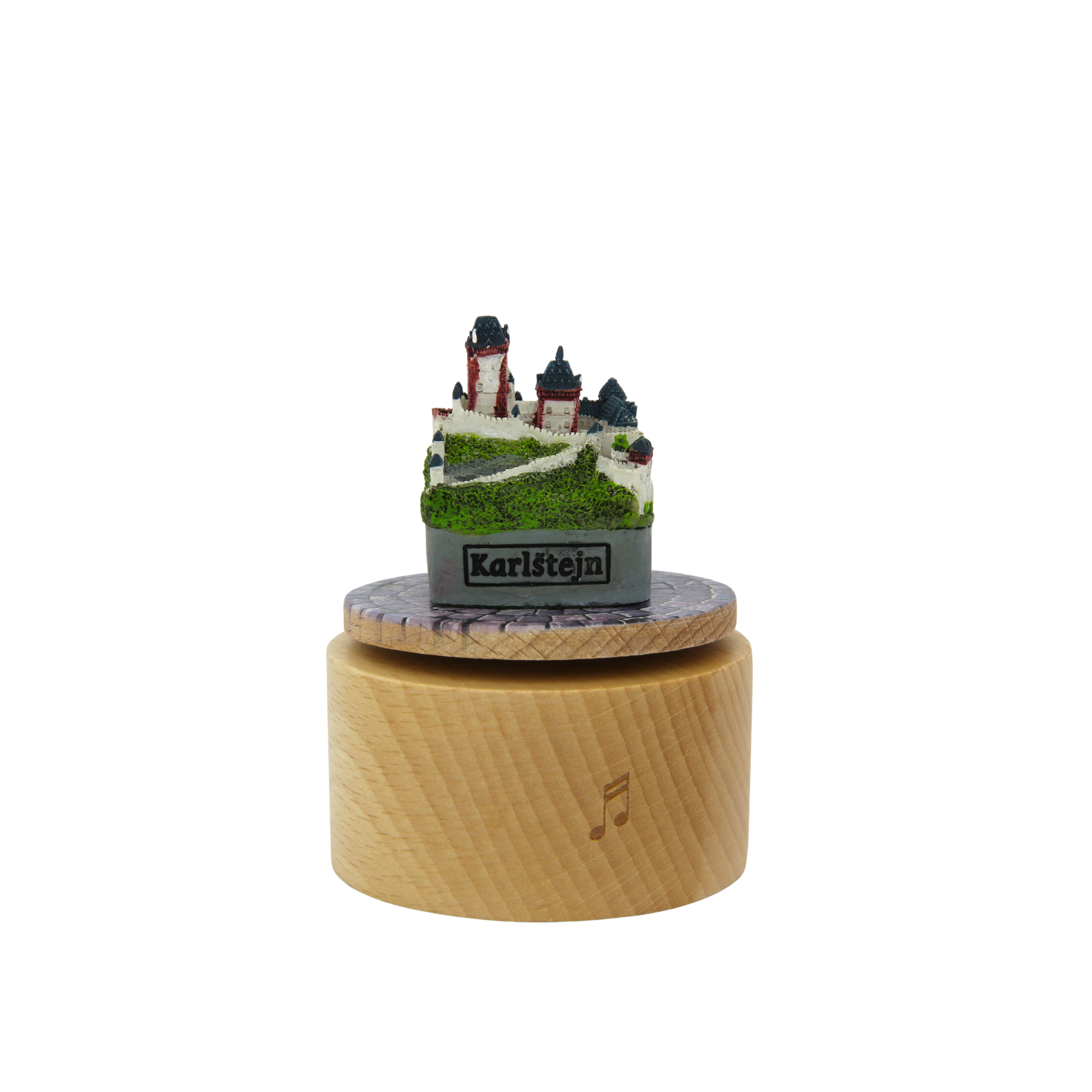 Tato velmi krásná otočná hrací skříňka s miniaturou hradu Karlštejn vám představí melodii od slavného českého skladatele Bedřicha Smetany nazvanou Praha. Hrad Karlštejn byl založen v roce 1348 Karlem IV., českým králem a římským císařem, jako jeho soukromé sídlo a místo pro uchovávání královských pokladů, zejména jeho sbírek svatých relikvií a císařských korunovačních klenotů.