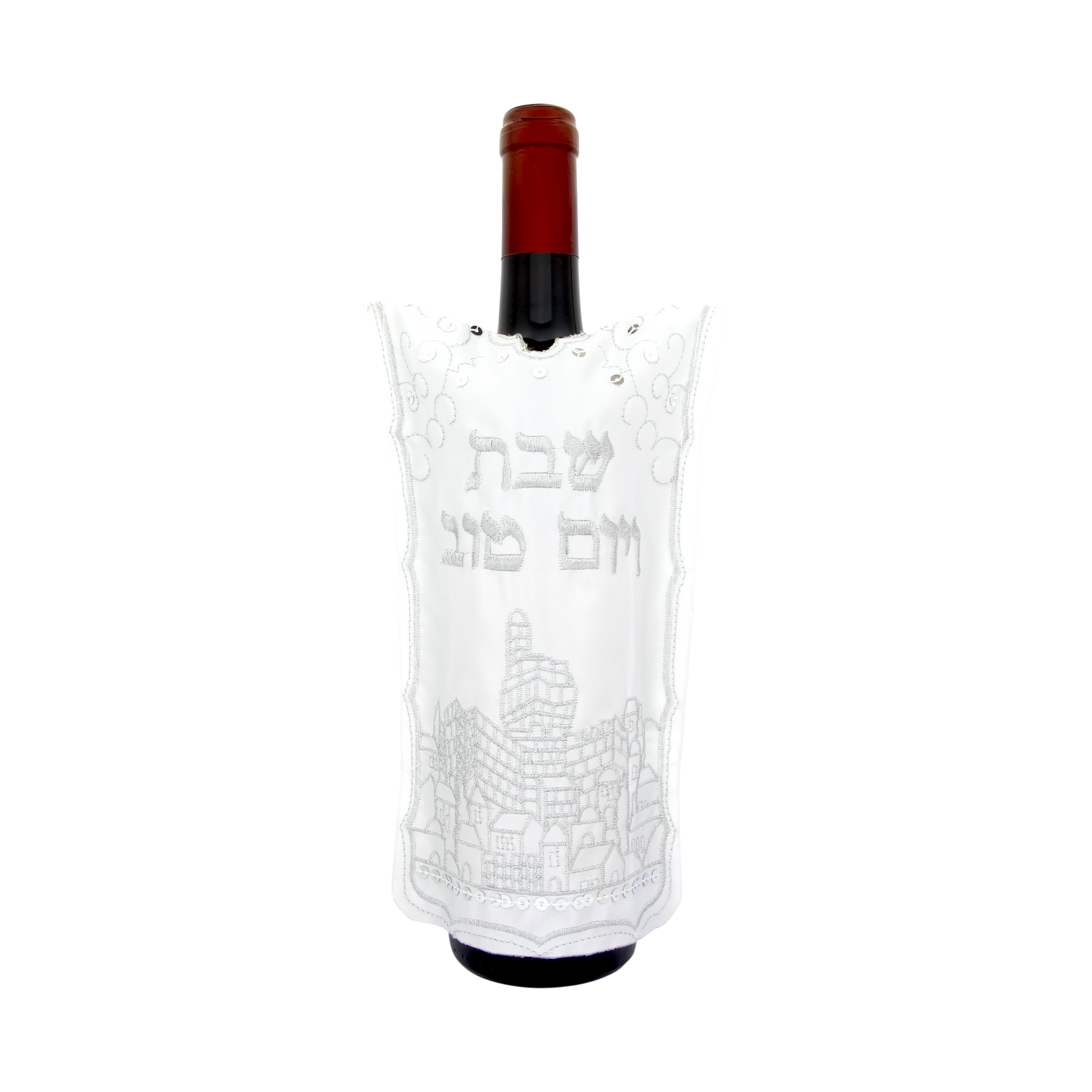 Saténový obal na víno zdobený nápisem שבת ויום טוב – Šabat a posvátná den a motivem města Jeruzaléma.