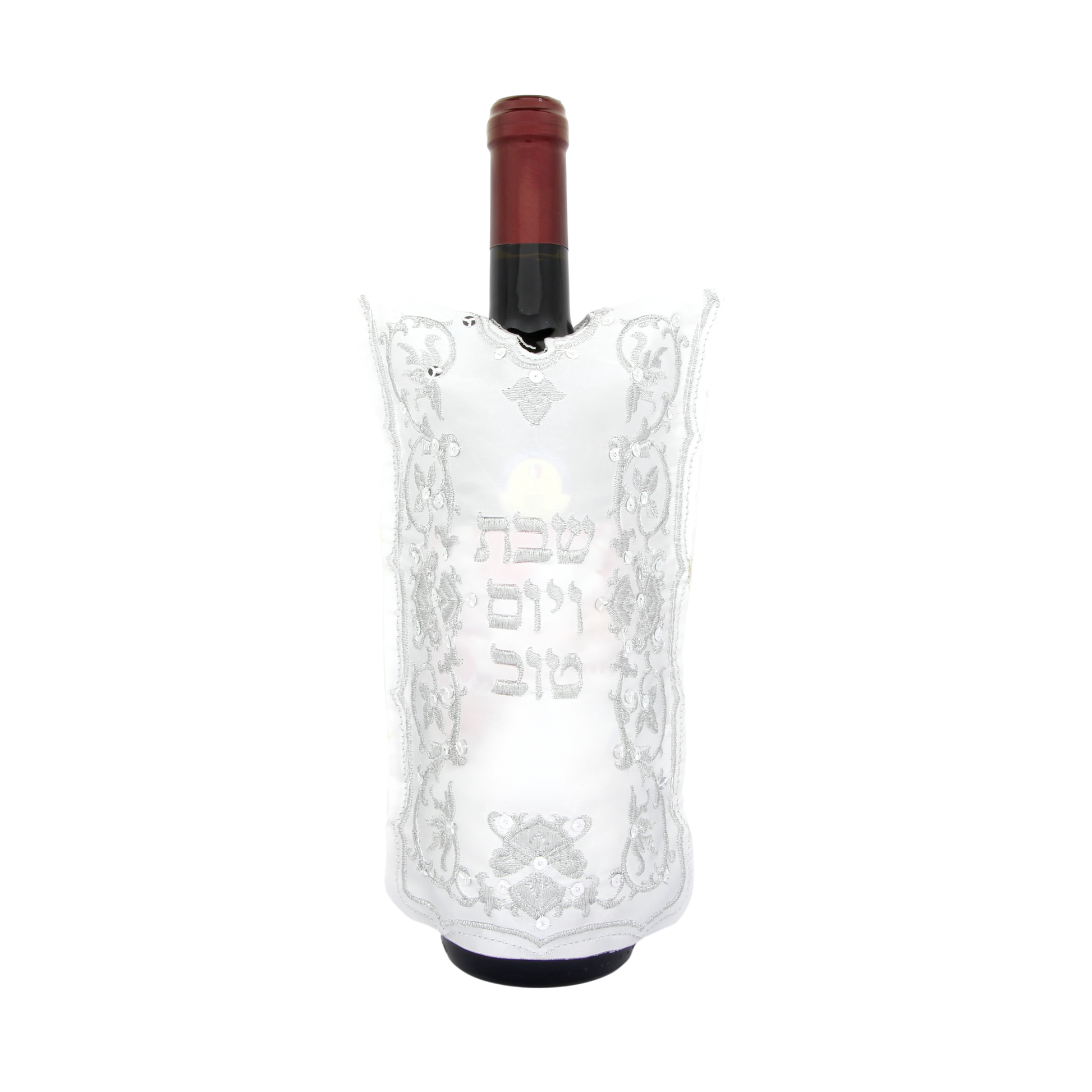 Saténový obal na víno zdobený nápisem שבת ויום טוב – Šabat a posvátný den.