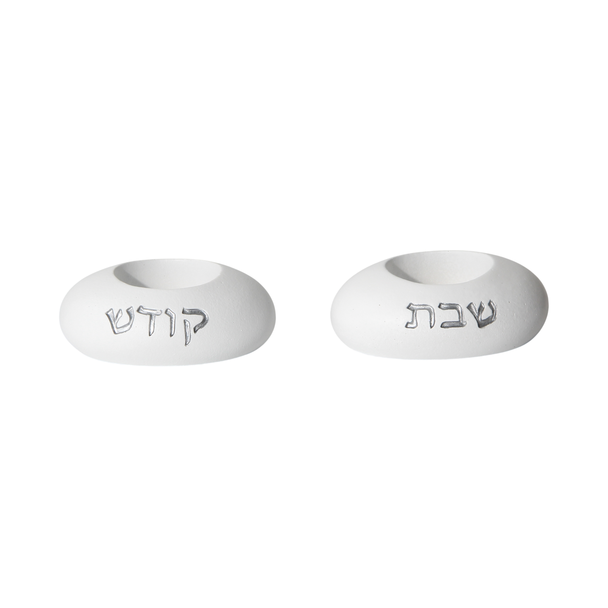 These polyresin Shabbat candlesticks look as if they were made of white cement, and their simplicity and symmetry bring harmony to any Shabbat table or festive setting.