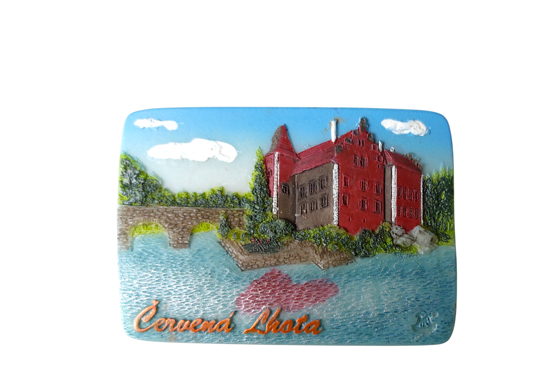 Ceramic magnet inspired by the Červená Lhota fairytale-like castle located in South Bohemia, Czech Republic. It's known for its distinctive red facade and picturesque setting on a water islet in a pond. The castle has a rich history, having undergone renovations in Renaissance, Baroque, and later styles. It's a popular tourist destination, open to the public and a designated national cultural monument. As these magnets are handmade, each piece is an original and may vary slightly in colour and weight.