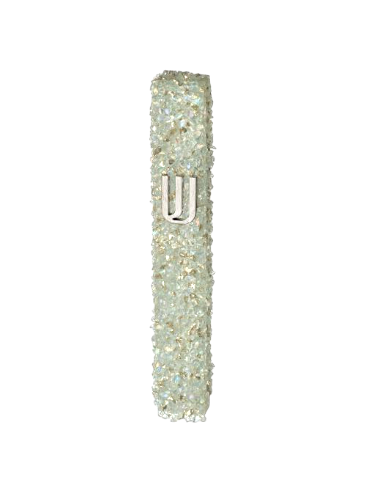 Elegant glass Mezuzah with white and grey stones. The mezuzah without a scroll. The scroll can be purchased separately.