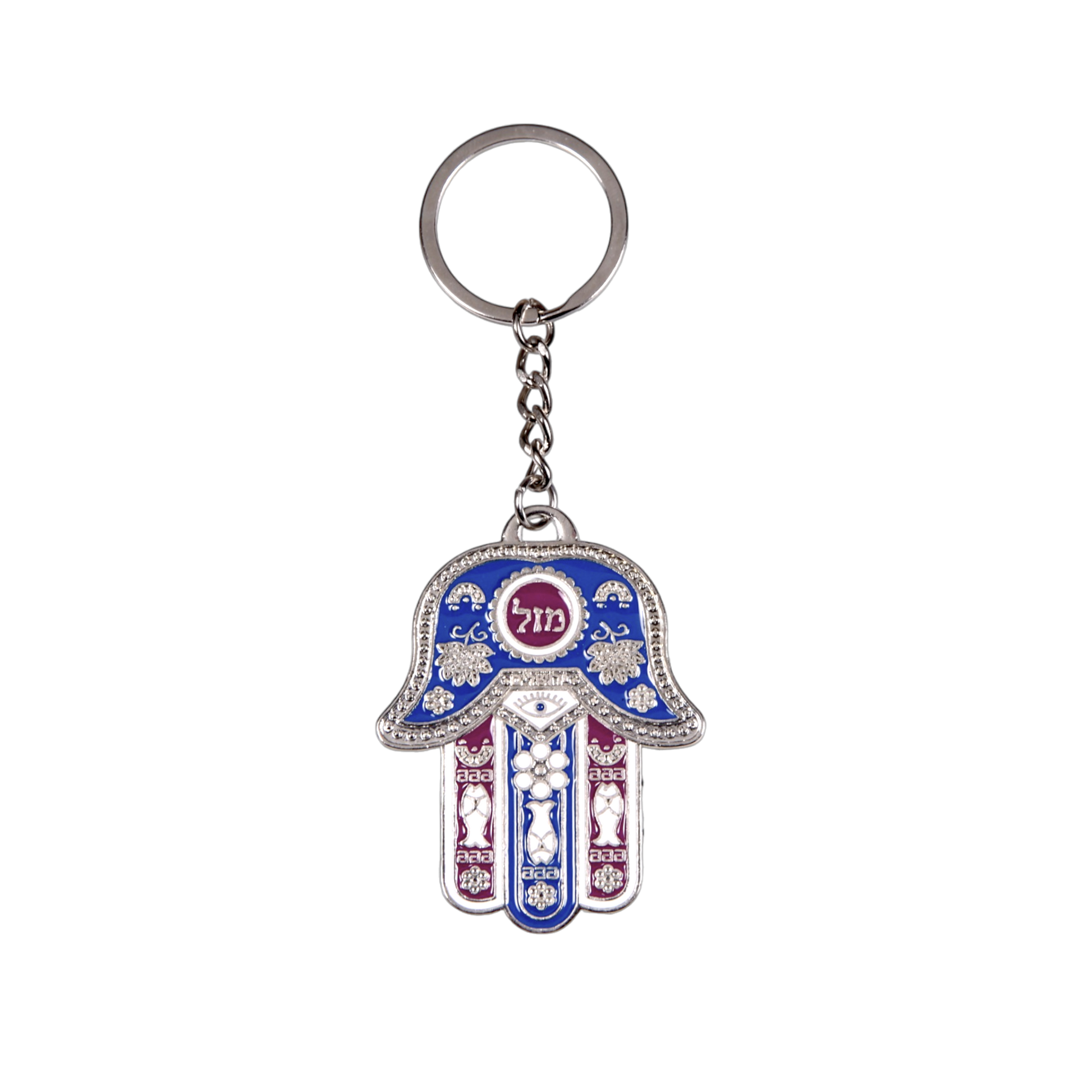 You can use this elegant metal Hamsa as a pendant for your keys. The Hamsa is a popular amulet in many cultures, it is considered as a sign of protection, supposed to bring peace and blessings. Our Keychains feature a multi-coloured design with floral decoration and the symbol of the Blue Eye (as a symbol of protection), fishes and the inscription Mazel (Good Fortune). Local production.