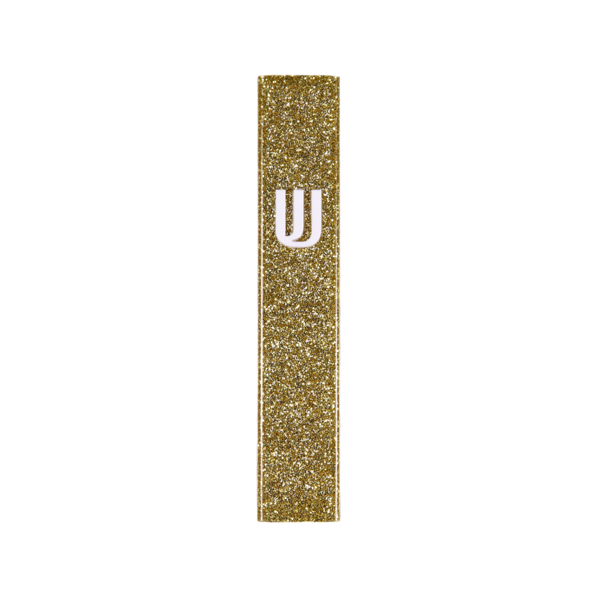 Perspex mezuzah covered with golden glitter and white Shin. The mezuzah without a scroll. The scroll can be purchased separately.