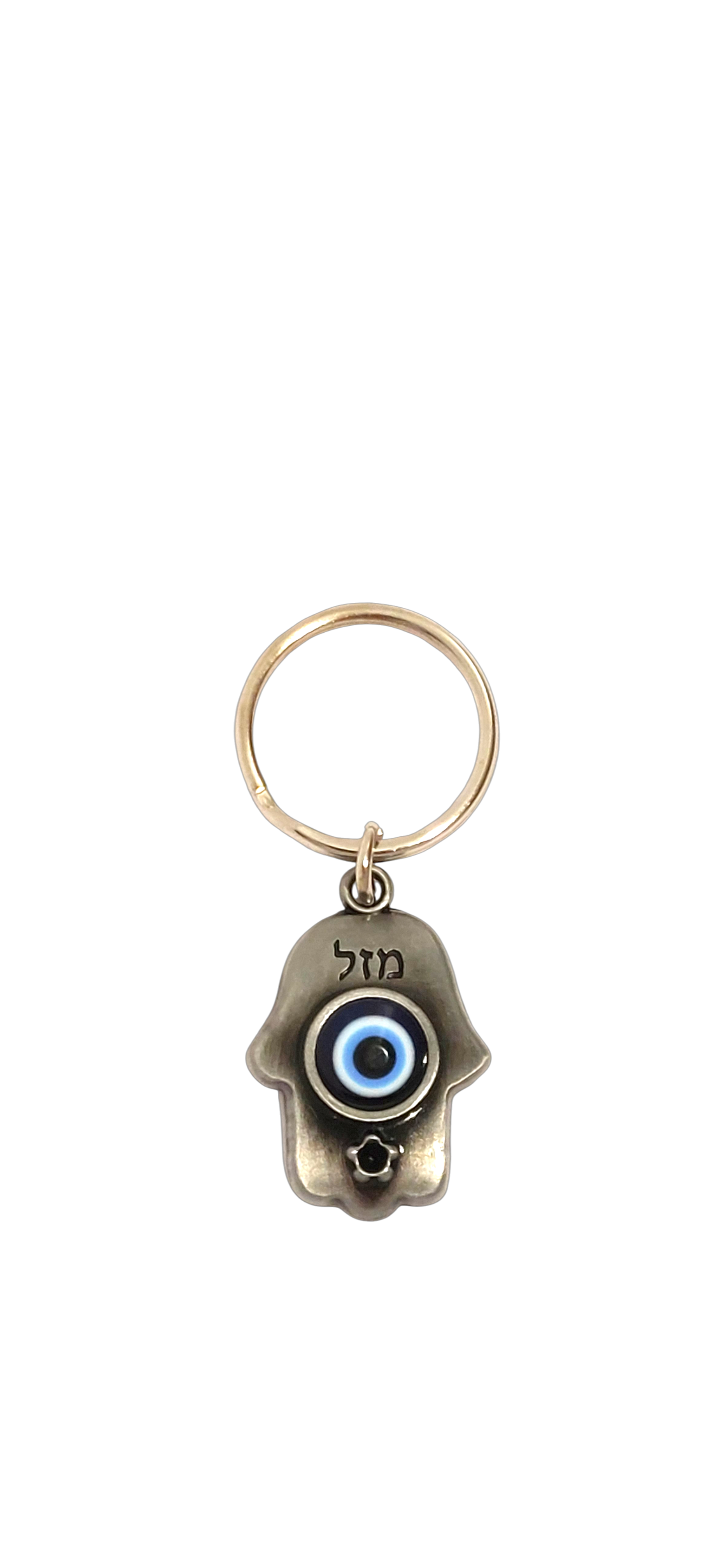 You can use this small metal Hamsa as a key chain. The Hamsa is a popular amulet in many cultures, considered a symbol of protection and believed to bring peace and blessings. This keychain is decorated with a Blue eye in the centre (as a symbol of protection), the inscription Mazal (Luck), and the Star of David.