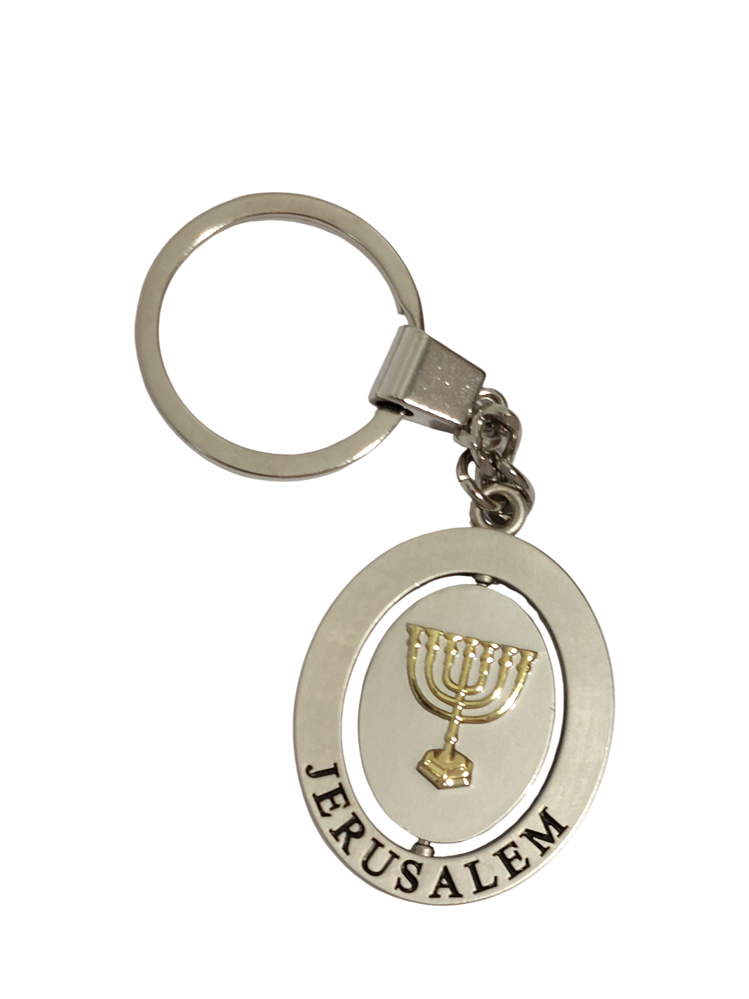 This rotating oval pendant can be used as a keychain. The high quality oval metal keychain is decorated with a golden menorah and a dove of peace.
