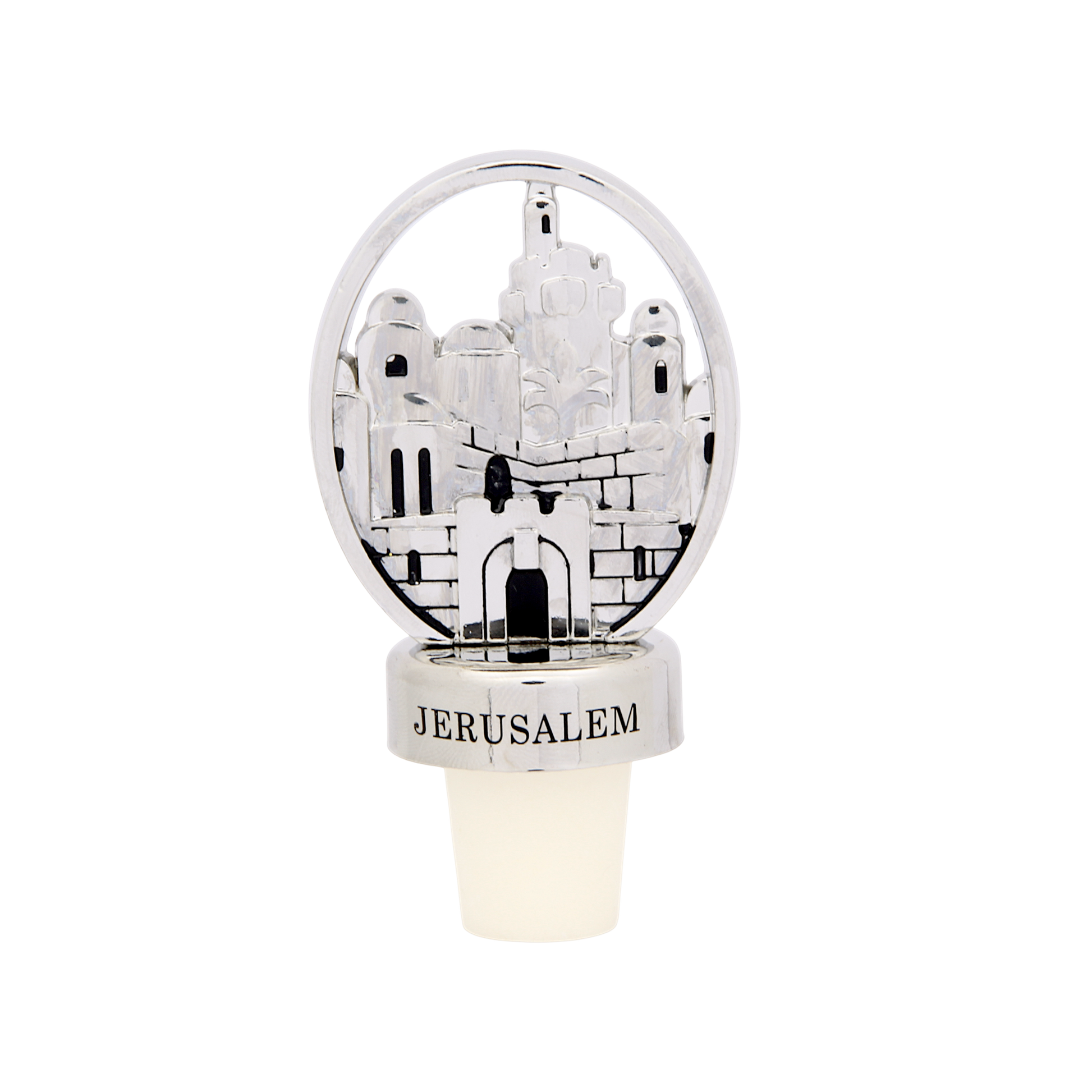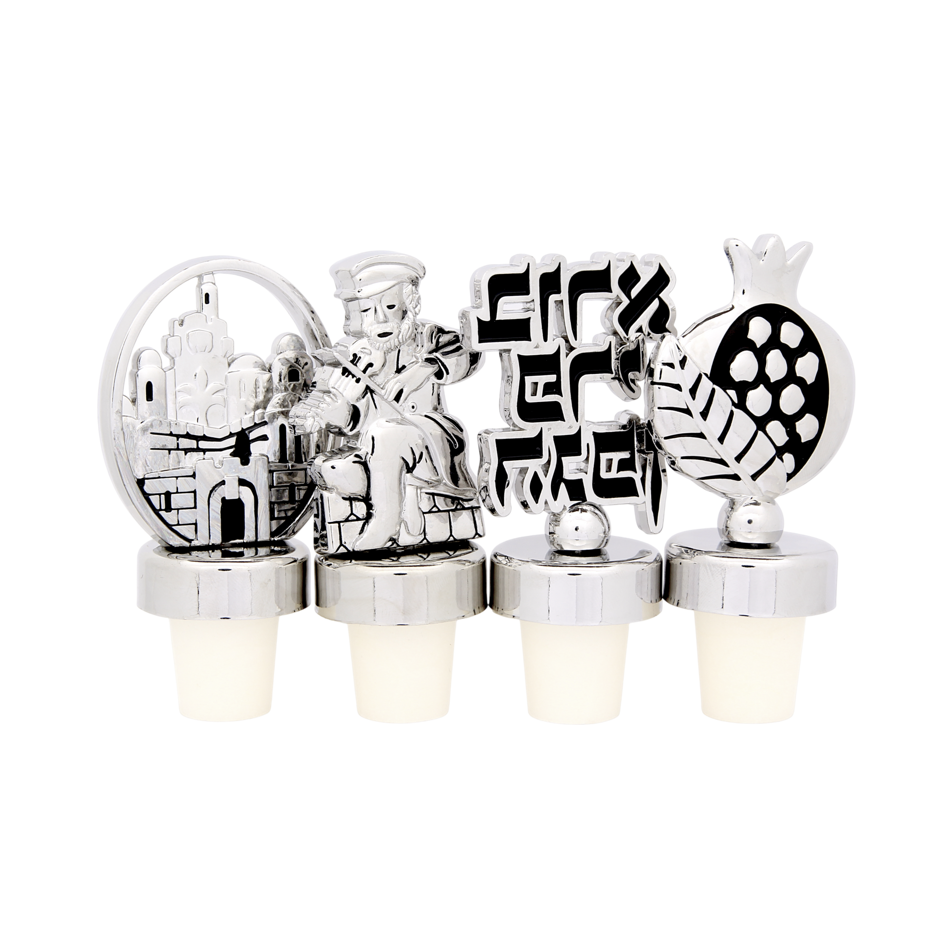 High-quality wine stoppers in four designs: Fiddler, Pomegranate, Jerusalem and Beracha with inscription: "בורא פרי הגפן" - "Creator of the fruit of the vine."